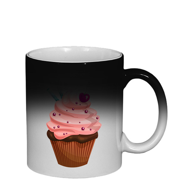 Magický 330 ml hrnek je černý, po zahřátí (např. kávou nebo čajem) zbělá, a objeví se tvůj navržený potisk. Vnitřek je vybarvený barvou dle výběru. V tvořiči proto navrhuje na bílý podklad. Lze potisknout levou i pravou stranu, nebo obě strany najednou. Je vhodný jako originální dárek. Jak magický hrnek funguje se můžeš podívat v našem videu.